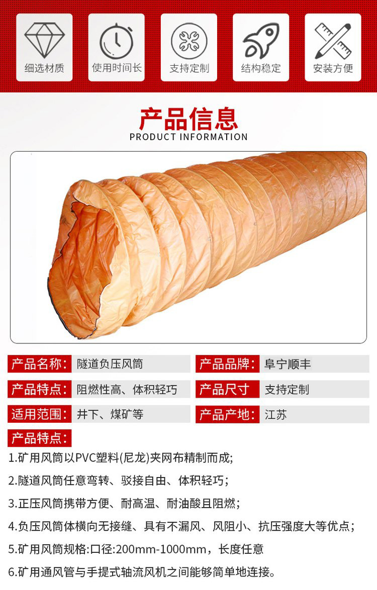 阜宁县顺丰矿用器材有限公司专业生产销售风筒、风筒布、压风自救器、隔爆水袋水槽、风筒连接器等矿用产品,厂家直销,价格优惠,品质保证,咨询热线:18361633988